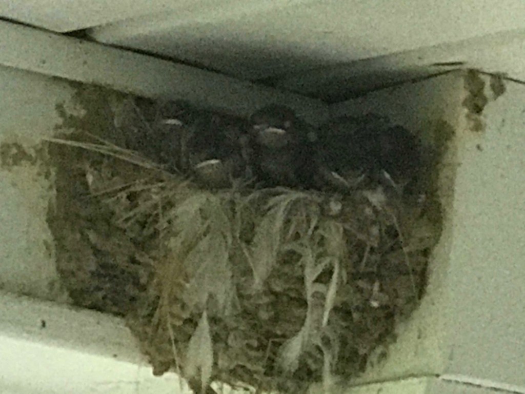 Barn swallows winter in Central and South America, so these little babies have some growing to do before migration begins in September. About half of barn swallows return to the same nest for years, so I guess I should leave it up after they’re gone. I’m going to have to convince farmer-husband to do that. He’s already counting the days to get rid of it.