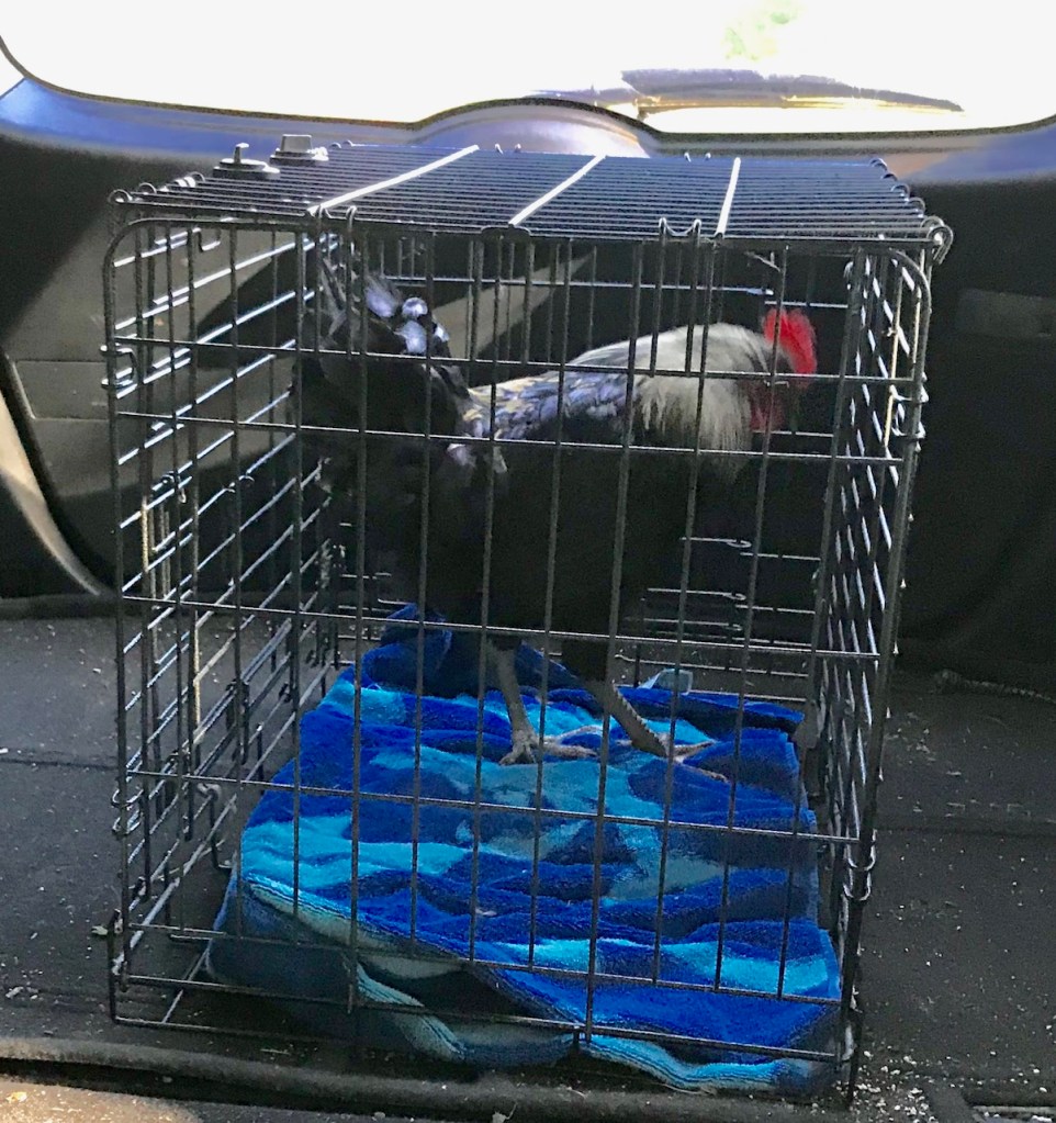 Earl spent the night in the crate in our laundry room, and I was sure he’d cock-a-doodle-doo again in the morning, but he was a little stressed and very quiet. In the morning, I placed the crate on the shaded back deck and decided to leave him in there for the day while I went to work. I planned to transfer him to the coop the second I returned home.