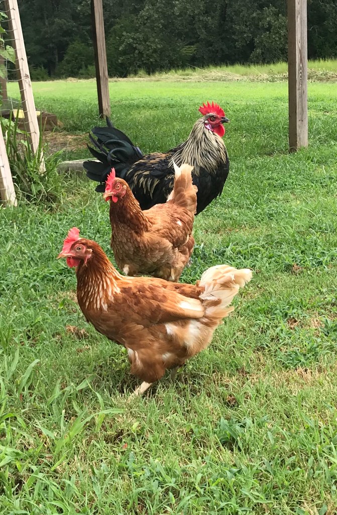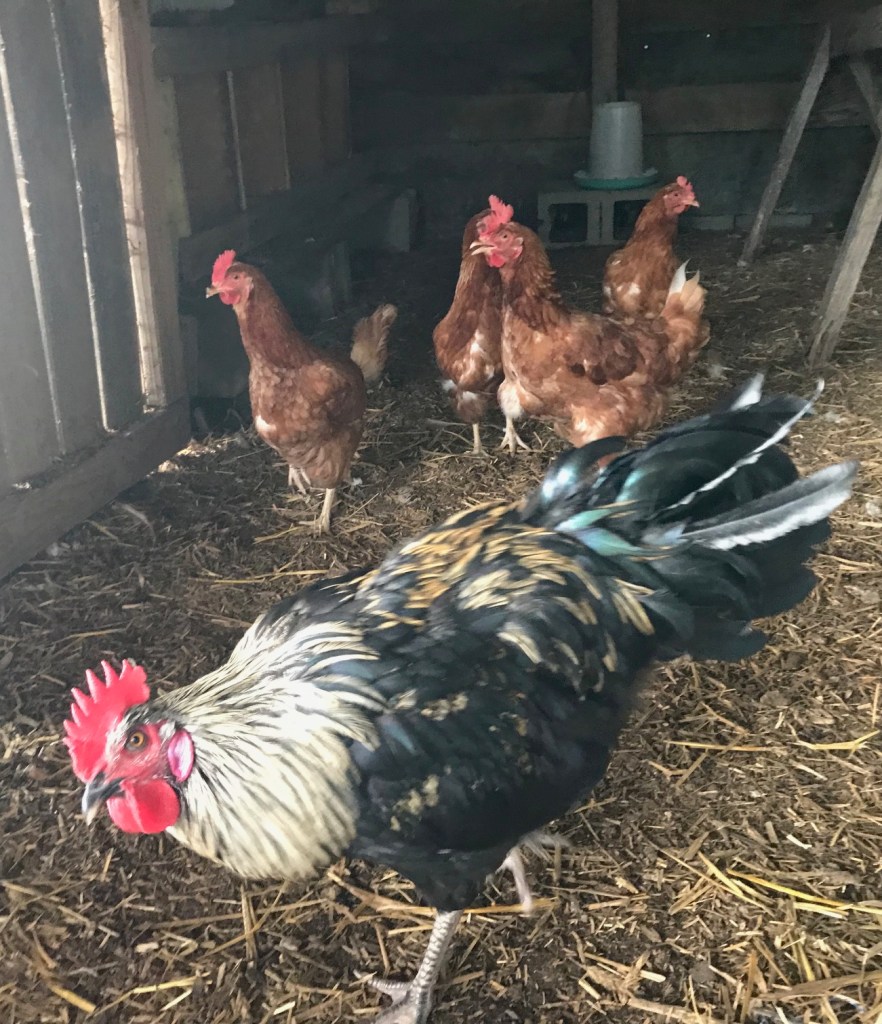 I have hens – no rooster. We lived in a place with neighbors, and I didn’t think they’d appreciate a rooster, but now that we have the farm, I kept my eyes open for the last two months for a chance to re-home an unwanted rooster. You know, people get a bunch of chicks every spring and always end up with surprise roosters they don’t want.
