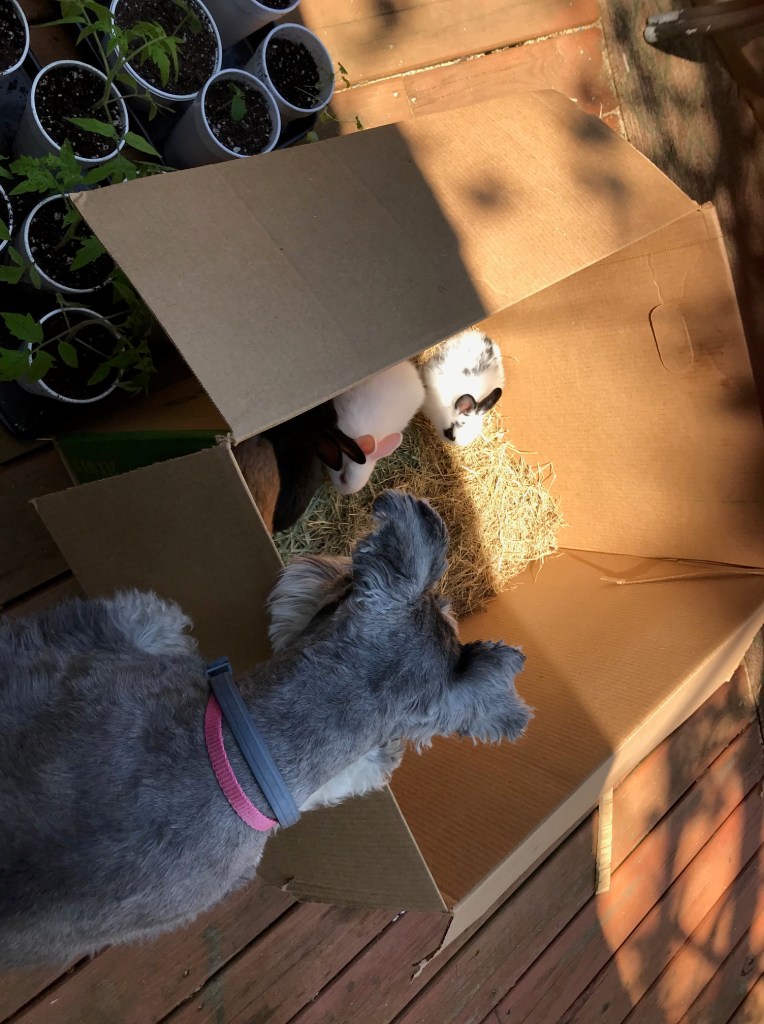 Pippa was excited and a bit confused at the hoppy little things. Her momma instincts wanted to protect them, but she seemed to know they weren’t puppies. She liked watching them, but if they hopped, it startled her and make her jump.