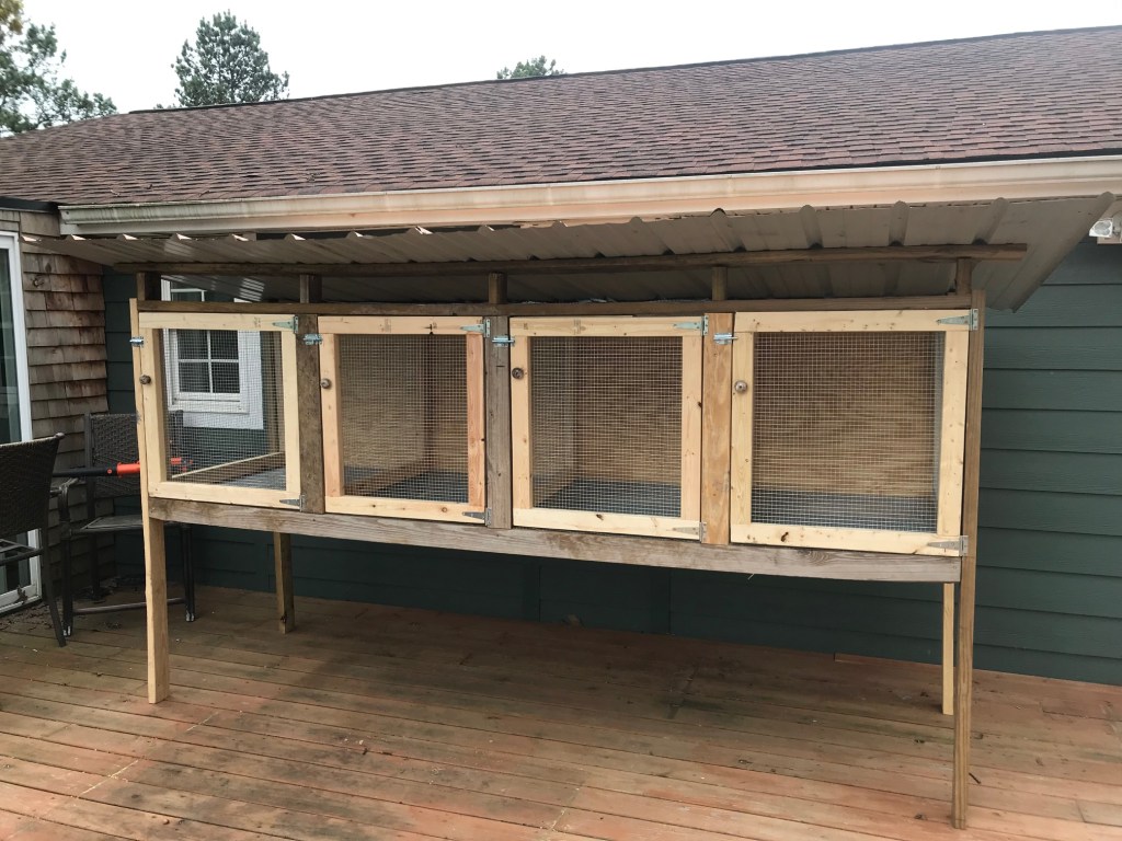 In typical Trace Creek Acres style, this is the moment Farm Hero started on the hutch. The bunnies stayed in a cardboard box for two days while the hutch was being built, but now they have a palace! I have a theory that the more you have to deal with something, the closer it needs to be to the house. Since rabbits need attention at least twice per day, we placed them on the back deck which only gets early morning sun. The rest of the day is shaded. (The back deck is 1000 sq ft, so there’s plenty of room.) Cost-wise, all materials were junk from around the farm except for the wood for the doors, the hardware cloth, and the hinges, for a total of about $160.