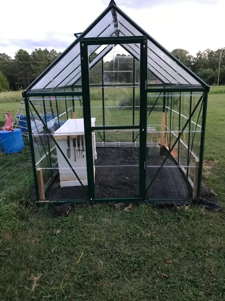 It arrived in a super heavy box in a gazillion pieces with an instruction book that was, I swear, an inch thick! Not as pretty as the initial advertisement, eh? Well, Farm Hero got to work, placing it exactly where I wanted it, and he paid serious attention to the foundation and leveling to make sure it would last a long time. After his second day working on the foundation in 95 degrees and high humidity, I asked him if he was on page two yet. The look he gave me meant he would probably bury my body under the greenhouse and they’d never find me. *Shrug* I thought it was funny.