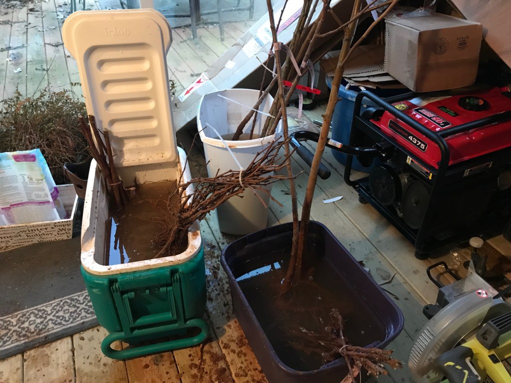 We ordered bare-root seedless Concord grapes and planted as soon as the ground would allow. Here in TN, that was January. We soaked them for a few hours, measured out a straight-ish line, and placed them 6-8 feet apart. That’s them soaking in the green cooler filled with muddy water. I ran out of buckets.