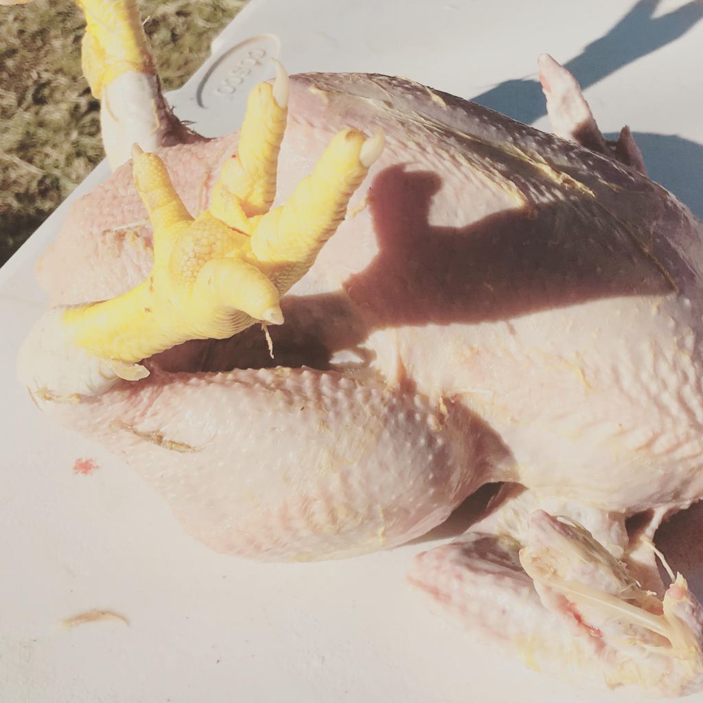 There are two common meat birds: Red Rangers and Cornish Cross. Red Rangers take 12-14 weeks to grow to processing size. The good thing about them is if the weather or your schedule doesn’t cooperate, you can delay processing a week or two with no problem. Cornish Cross take about 8 weeks to grow to processing size. They grow so fast and are so big, that if you can’t process them when scheduled, you take a risk of them dropping dead of a heart attack or breaking their own legs due to their weight. Red Rangers are about 4-5 lbs processed, Cornish Cross are about 6-8 lbs. More meat in 1/2 the growing time. That’s less time, less care, and less food you have to supply. I prefer Cornish Cross.