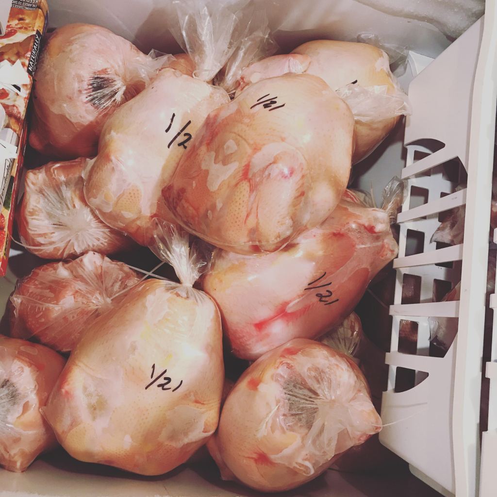 We process about 30 birds twice a year. I don’t do more as I don’t have the fridge space for them. You can do anywhere from one to one hundred, as long as you have the time and space. The reason I say “about 30” is that you always lose some. Generally, you’ll lose 5%. The previous batch I ordered, three were dead on arrival. This batch, all arrived alive but we lost one the first day. You will never get 100%.