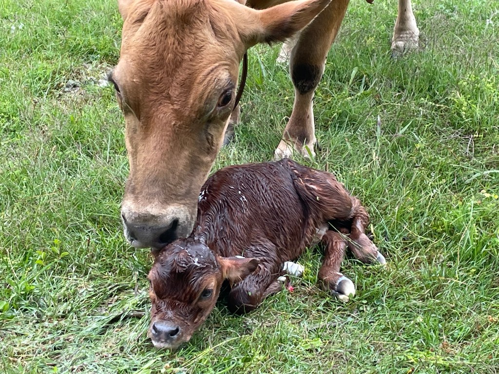 She was due June 13 but started showing signs of impending labor May 23. She got very solitary, hanging out in the barn a lot, then refusing to eat her grain which is completely unlike her, and by May 30, she was acting very lethargic and shuffling her back feet like it was painful to walk. Fortunately, she calved with no issues on June 1!! We got a beautiful little heifer calf whom we named Callidora, which is an ancient greek name meaning Gift of Beauty. We call her Callie, for short.